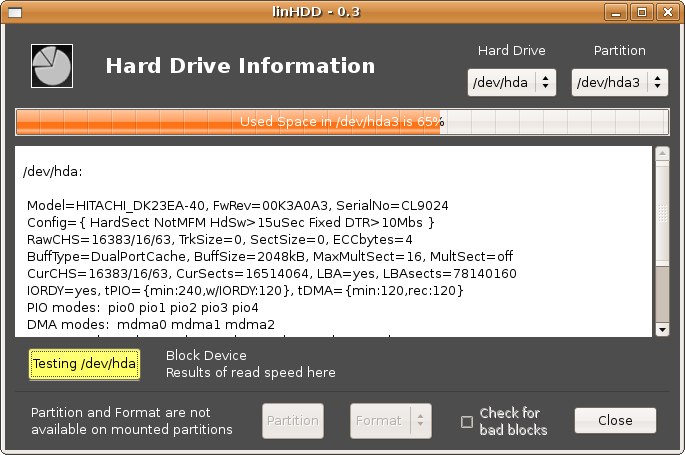 Alternatively unpack the linHDD-0.4.tar.bz2 and copy the LinHDD.py file into the /usr/bin folder. This is sufficient cause the application consists of a single Python script. Remember you have to be root to carry out this installation.