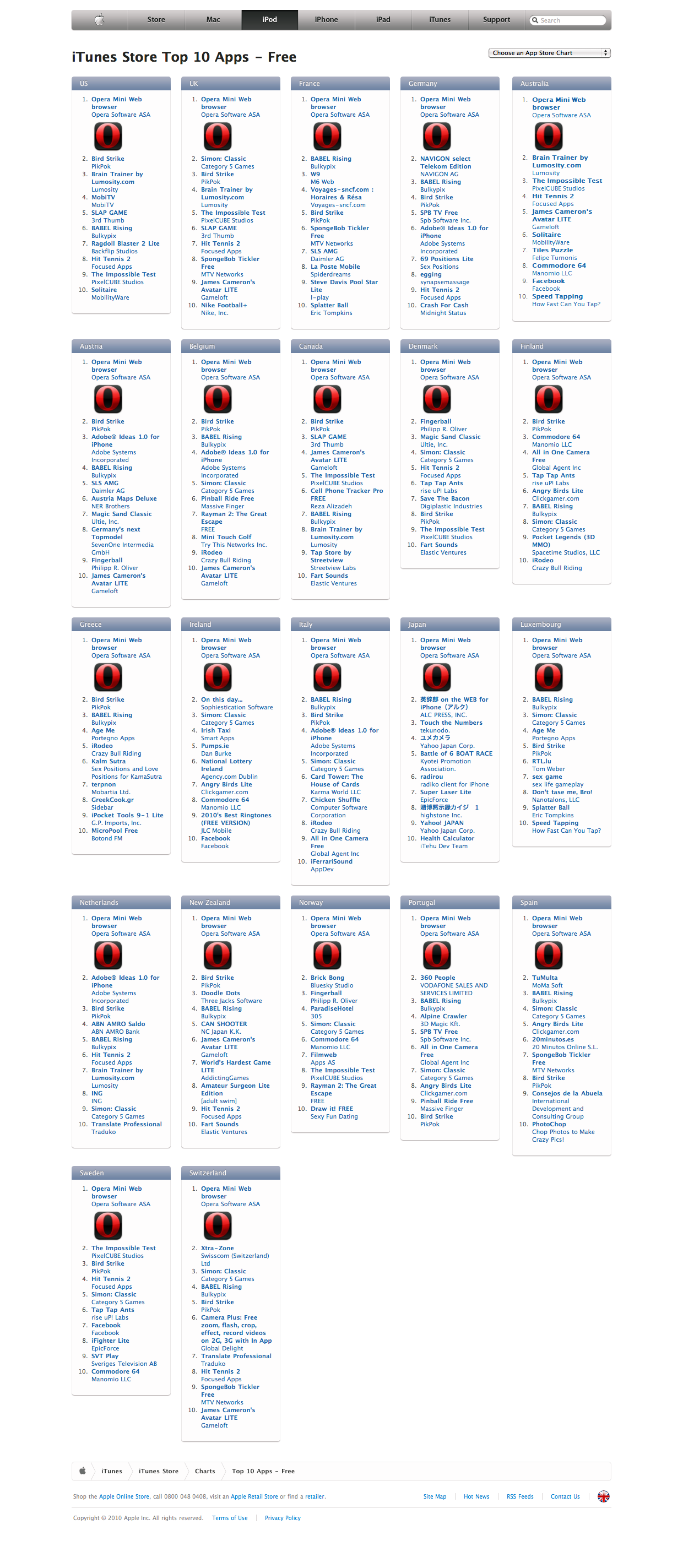 Do you still doubts the browser of the moment is Opera, Mini. Well, this is for you, Opera Mini was downloaded one million times in its first day of availability in each market, and is currently the most downloaded iPhone app in iTunes App Stores, in 22 different countries including the US, UK, France, Germany, Canada, Italy – as this chart shows.