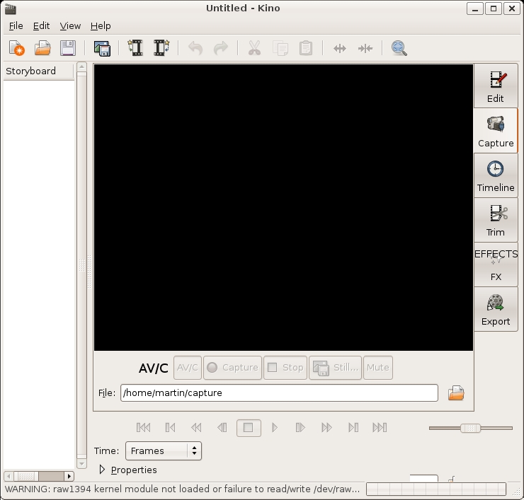 Kino is nonlinear editor software. It can capture raw video, edit and re-organise it, and export the final results. With additional free, extra-cool plugins, Kino gives you all the necessary tools to make good movies. To do all of these all you need is the IEEE1394 interface on both sides, the PC and camcorder to be able to send the video stream from a camcorder to a PC and back. Check your PC; many modern computers, including laptops, have this interface already built-in.