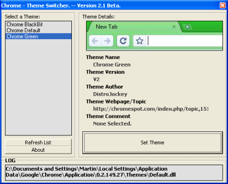 Wow, Google can take all the time it needs before making available API’s or extensions for it new browser Google Chrome, in the mean time on the web, all types of hacks on the Google Chrome are popping up. Recently I found on the ChromeSpot Forum , a so-called Chrome Automatic Theme Switcher. This little application changes the skin of your Google Chrome browser. The application bundles up three ready to use skins — skins, that the author of this application found on the net, so you can make yours. If you find other themes then just place them in \ReleaseV2.1\Themes folder and use the Chrome Automatic Theme Switcher to upload.