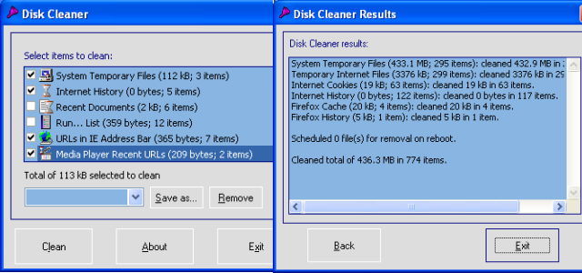 Disk Cleaner focuses on ease of use, small size and speed – its rather very fast when cleaning your system. It installs no .DLL files on your system, so it can run it from your flash drive. Disk Cleaner can automatically run at system start without any intervention.