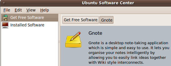 Likewise Gnote (a mono-free alternative to Tomboy) also makes it into the Karmic Koala repository. You can get it installed with sudo apt-get install gnote or via the “Ubuntu Software Center”; Applications -> Ubuntu Software Center