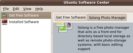 Your mono-free photo manager for Gnome and non, Solang (alternative to F-Spot)) is now included in Ubuntu 9.10 repositories. Karmic Koala users can now install Solang v0.3 from the command-line with sudo apt-get install solang or via the “Ubuntu Software Center”.